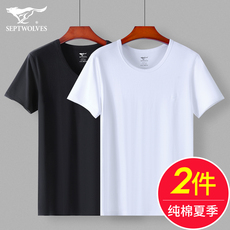 七匹狼纯棉圆领男士打底衫短袖t恤宽松2件装纯色长绒棉夏上衣睡衣