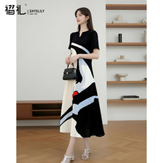 三宅褶皱海边沙滩裙妈妈连衣裙夏季新款短袖气质印花大码女装长裙