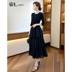 黑色连衣裙春装新款2026三宅气质女装蛋糕裙修身显瘦显瘦褶皱长裙