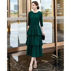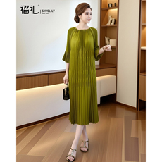 三宅褶皱绿色裙子春季2026新款女装宽松大码弹簧裙洋气妈妈连衣裙