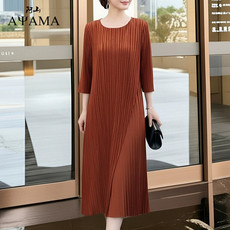 三宅气质女装连衣裙2026春季新款长袖气质褶皱中长款妈妈裙子洋气