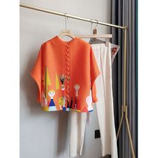 三宅系列褶皱新款上衣包扣桔色小个子女装印花洋气蝙蝠袖气质外套