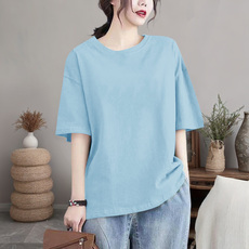灰色纯棉短袖t恤女夏季正肩宽松显瘦圆领休闲百搭女士半袖T恤上衣