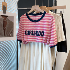 圆领提花条纹针织衫女2025夏装新款宽松慵懒风上衣薄短袖t恤衫潮