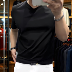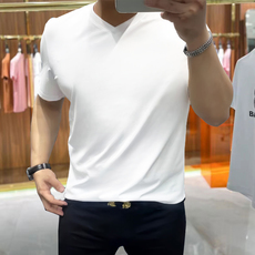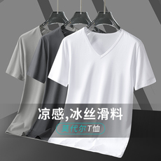 冰丝男士短袖T恤V领修身丝光棉滑料青年加大加肥丝滑鸡心领男体恤