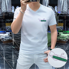 【XL175】男装 夏季 时尚休闲丝光棉印花潮流 男士修身V领短袖T恤