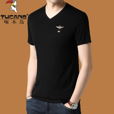 啄木鸟夏季丝光棉短袖T恤男纯色宽松冰丝半袖薄款V领休闲大码t恤