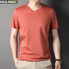 冰丝短袖T恤男士丝光纯棉夏季修身新款休闲V领半袖纯色爸爸体恤