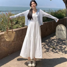 紫涵长袖遮阳罩衫收腰打揽a字吊带连衣裙两件套装女2025夏季新款