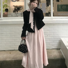 富家千金套装裙女秋冬高级感粉色挂脖长袖连衣裙小香风外套两件套