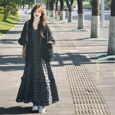 韩系时尚气质穿搭宽松格纹连衣裙女搭配黑色针织开衫秋季两件套装