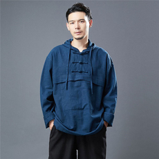 春秋季中国风男装苎麻纯色中式盘扣卫衣宽松带帽休闲款上衣居士服