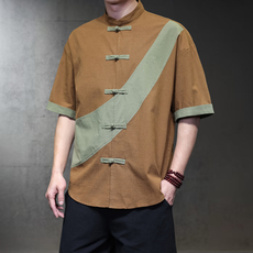 新中式立领唐装男复古七分袖中国风短袖亚麻衬衫棉麻中山装