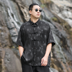 半墨大码男装新中式短袖衬衫春季中国风印花盘扣唐装宽松男士衬衣
