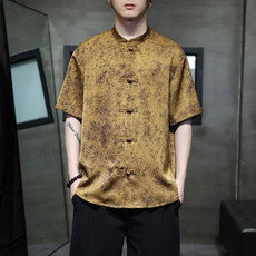 新中式2025夏季冰丝短袖衬衫男款中国风复古立领上衣汉服唐装衬衣