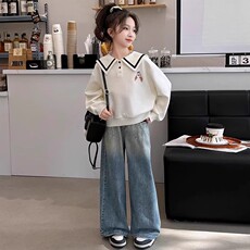 128-170欧美中大女童绒面烫钻猫咪字母卫衣+喇叭长裤
