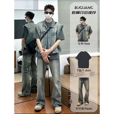 美式复古磨破牛仔马甲无袖男模穿搭高级感套装牛仔裤子搭配一整套