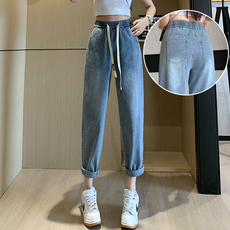 松紧腰老爹牛仔裤女2025春季新款宽松初中高中学生系绳哈伦萝卜裤