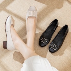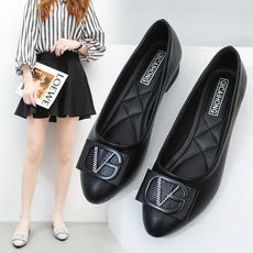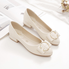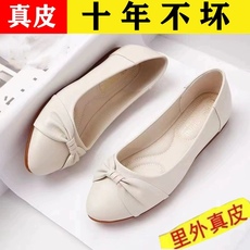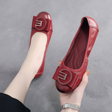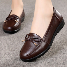 春季蝴蝶结圆头浅口单鞋女皮鞋中年妈妈鞋真皮平底豆豆鞋软底女鞋