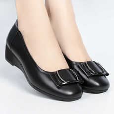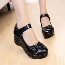 时尚坡跟女鞋真皮高跟鞋春季中年妈妈鞋浅口单鞋黑色34码皮鞋软底