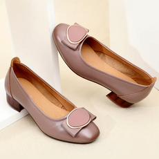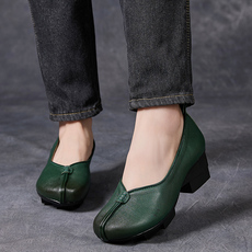 复古真皮中粗跟中年妈妈女鞋春季新款民族风浅口旗袍单鞋国风鞋子