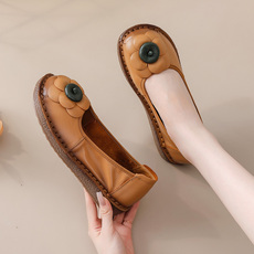 秋季真皮花朵单鞋舒适超软民族风妈妈鞋平底厚底中年软底女鞋百搭