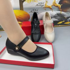 浅口单鞋坡跟工作皮鞋白色旗袍跳舞礼仪高跟鞋中年妈妈一字扣女鞋