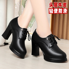 中年女士系带皮鞋高跟鞋厚底深口单鞋春秋妈妈鞋子女款真皮女鞋黑