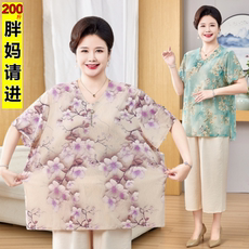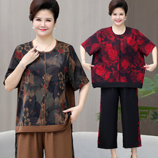 中老年人夏装女短袖小衫胖奶奶冰丝T恤妈妈薄款洋气上衣大码套装