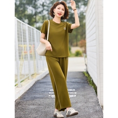 中年妈妈夏装冰麻短袖套装洋气2024新款中老年女装夏季两件套大码