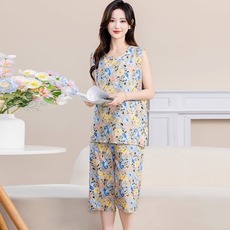 妈妈夏装棉绸套装女无袖七分裤中老年人造棉睡衣家居服两件套上衣