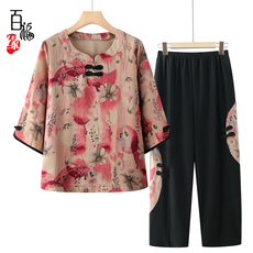 AB短袖宽松薄印花圆领睡衣中裤开衫家居服夏装奶奶女士套装中老年
