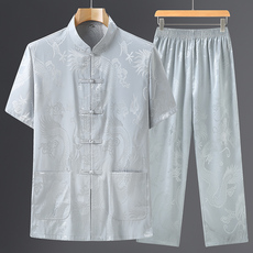 唐装男中老年爸爸装夏装棉绸短袖套装提花两件套夏季中国风男装