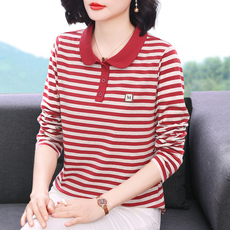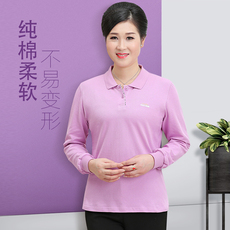 新款中老年妈妈装翻领t恤长袖纯棉polo衫中年女春装大码纯色上衣