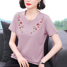 妈妈夏季新款纯棉刺绣短袖T恤衫中老年女装减龄宽松洋气上衣小衫