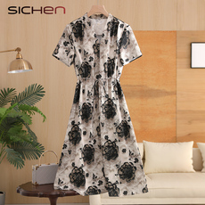 喜卉妈妈夏装短袖连衣裙优雅气质中老年女装洋气遮肚裙子2025新款