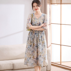 喜卉妈妈夏装气质V领碎花连衣裙中老年女装洋气系腰雪纺裙子短袖