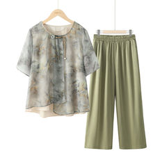 妈妈夏装套装雪纺时尚上衣2025新款中老年女装夏季短袖T恤两件套