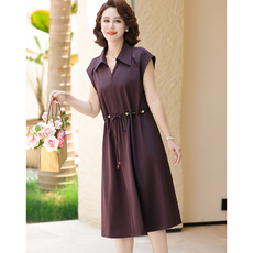 时尚V领连衣裙中年妈妈夏装中老年女装洋气系带收腰显瘦短袖裙子