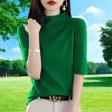 2025秋女半高领五分袖羊毛针织衫套头毛衣纯色打底衫宽松大码短袖