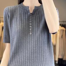 夏季V领短袖100羊绒针织衫女薄宽松套头百搭五分袖打底衫洋气上衣