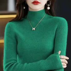 旺秋超细羊毛半高领套头针织衫中袖女装打底衫五分袖毛衣女上衣