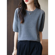 100纯棉半袖针织衫女2025新加厚宽松套头短袖打底衫全棉中袖毛衣