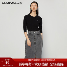 马天奴女装春秋新款纯色五分袖针织衫T恤套头衫上衣含羊毛圆领