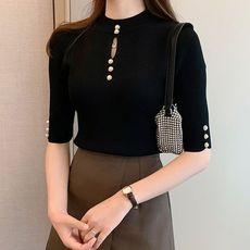 新款半高领纯色针织短袖女短款修身五分袖T恤衫上衣套头打底毛衫