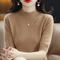 水溶羊毛秋季五分袖修身内搭针织衫半高领简约百搭套头女打底上衣