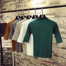 秋装新款韩国螺纹半高领中袖针织衫女装套头五分袖紧身打底衫上衣