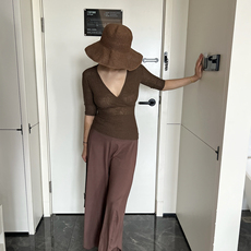 SECRET DINDI 淡妆浓抹 针织交错感v领咖色上衣女秋五分袖套头衫