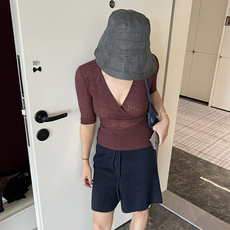 纯棉线半袖V领打底针织衫女套头中袖毛衣韩版宽松上衣短款春秋夏