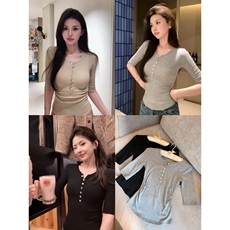 好穿~特别百搭性感紧身显廋微透五分袖薄款上衣韩国T恤女 有垫肩
